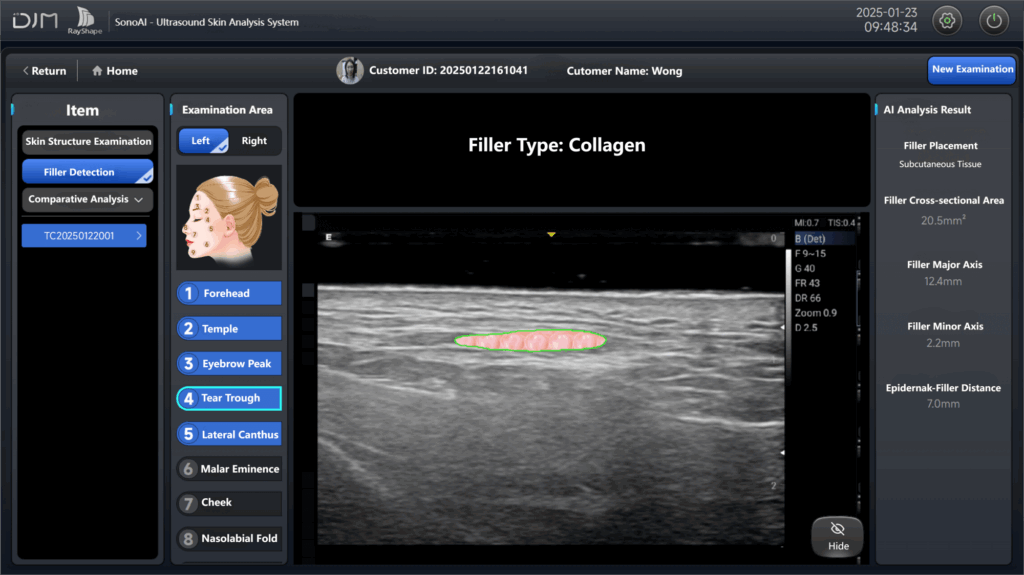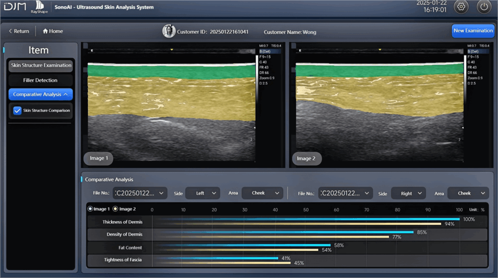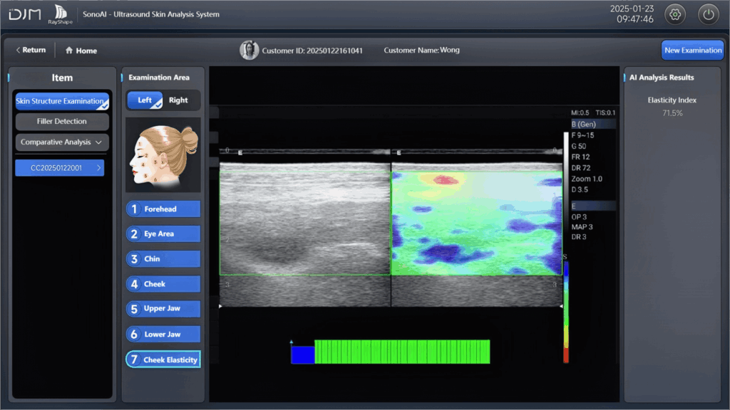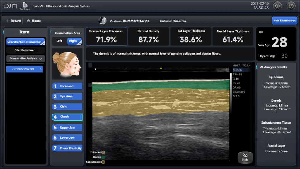 Accurately measures the thickness and coverage area of the Epidermis, Dermis, and Subcutaneous Tissue. Analyzes dermal density, fat content, SMAS tightness, skin elasticity coefficient, and the distance between the SMAS and epidermis. Enables precise evaluation of structural issues and aging conditions across all skin layers.